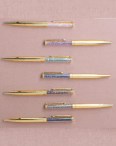 Caneta esferográfica de tinta azul com pedras naturais em formato cascalho. Com acabamento dourado é uma peça ideal para presentear e ter a energia das pedras naturais em suas mãos. Acompanha embalagem em acrílico transparente e etiqueta com QRcode para mais informações sobre o produto. É possível substituir a carga da caneta.