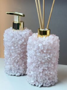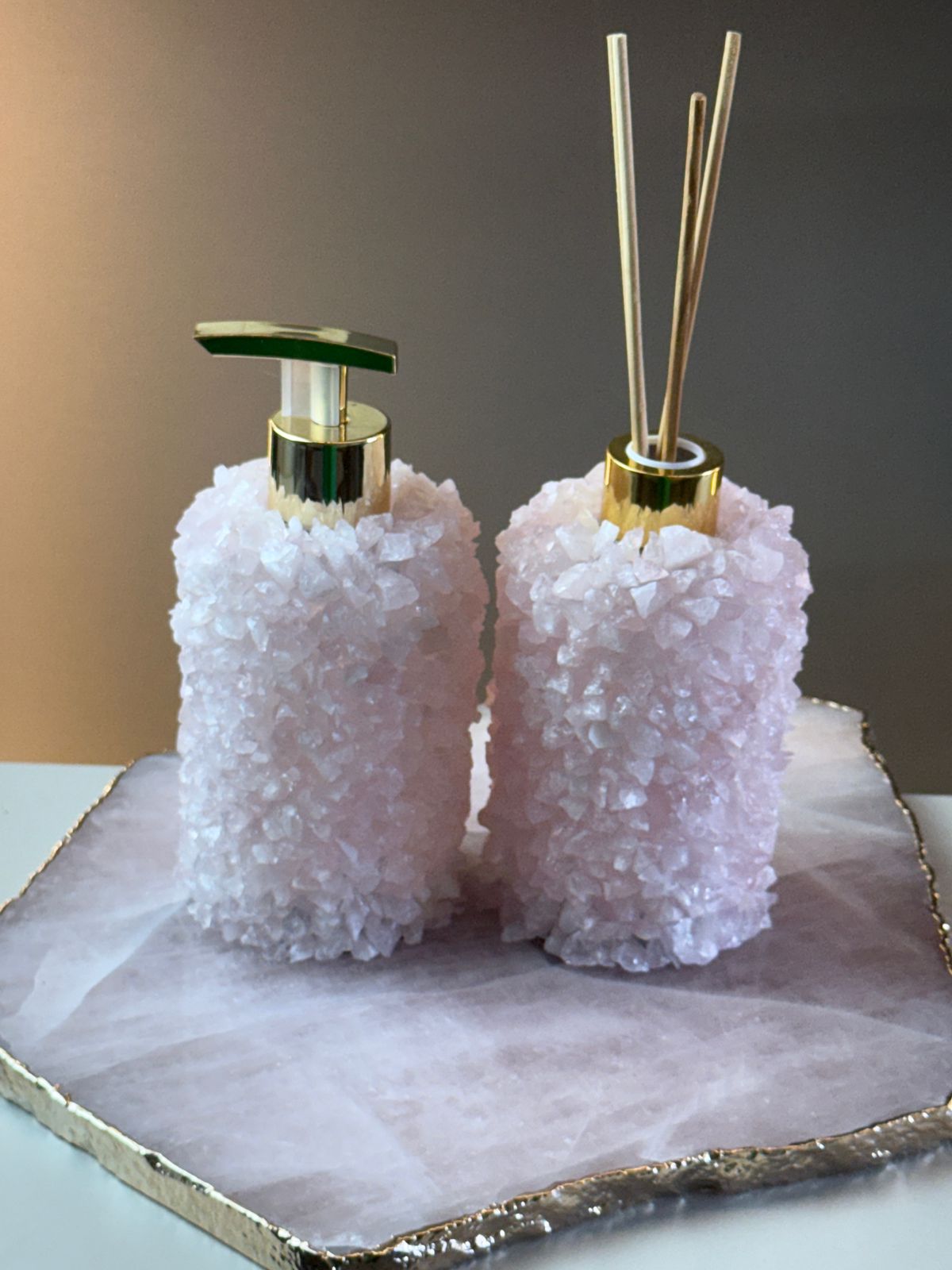 Kit Lavabo Difusor e Saboneteira Pontas Cristais Naturais, uma combinação perfeita de funcionalidade e luxo para elevar o estilo do seu lavabo.